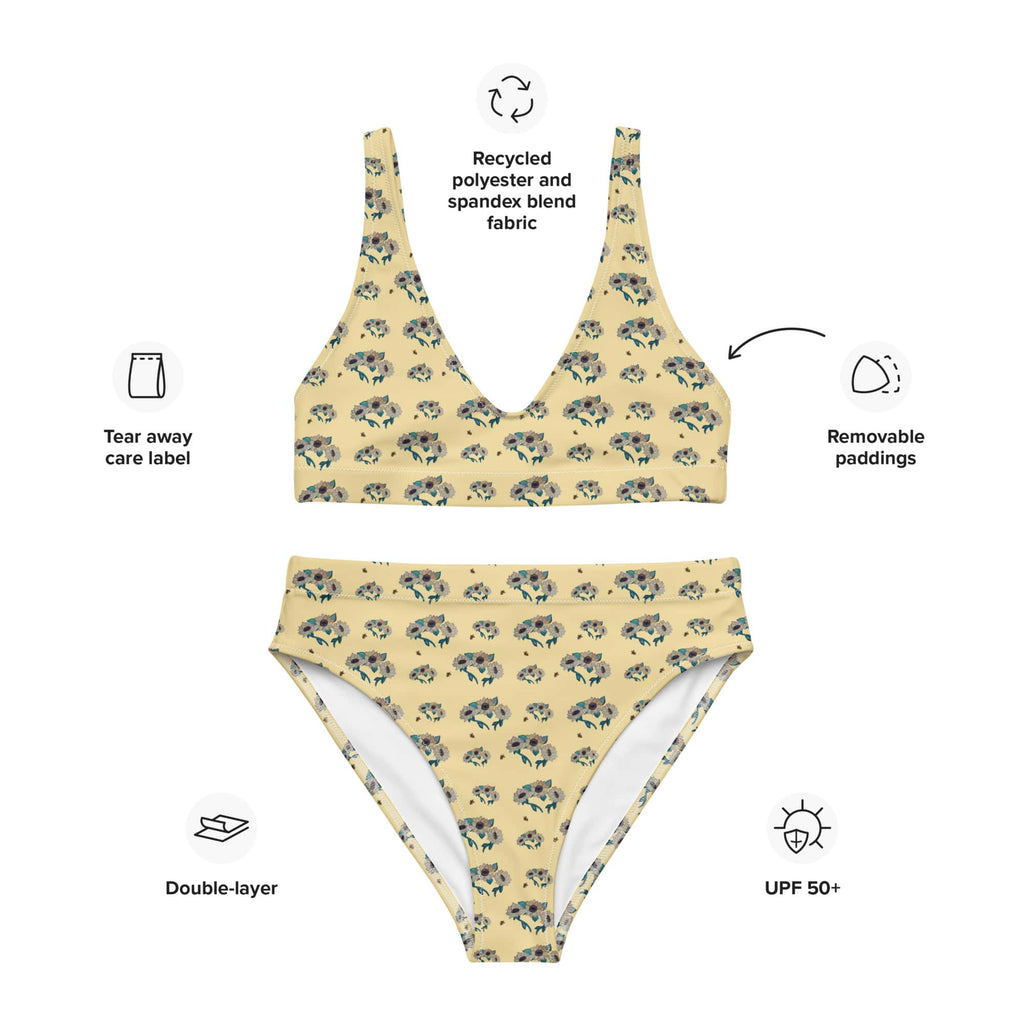 Sunflowers & Bees Print: Recycled High-Waisted Floral Bikini with UPF 50+ Protection