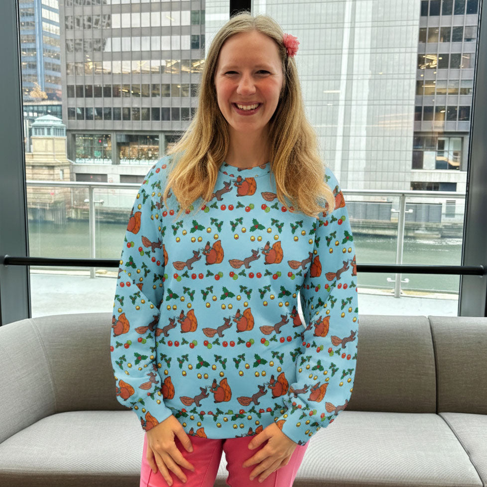 Add a touch of autumn whimsy to your wardrobe with the Cozy Squirrel Fall Women's Sweatshirt. Featuring a delightful squirrel and autumn harvest pattern on a refreshing blue background, this sweatshirt brings a fun and seasonal vibe to any outfit.